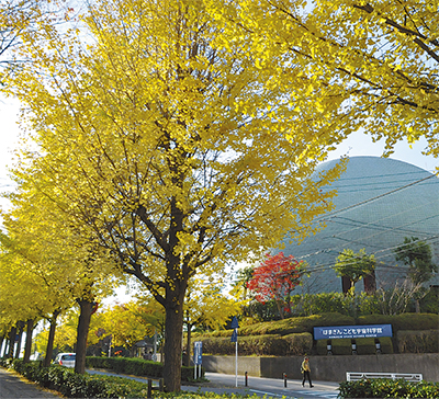 洋光台にあるはまぎん こども宇宙科学館横のイチョウ並木が、黄金色に色付き、見頃を迎えている(11月21日撮影)。