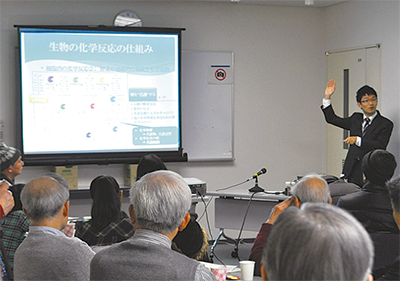白井さんは、微生物の力で大気中の二酸化炭素を資源化する研究を行っている。講演では、化学反応に関する難しい用語なども、身近な例をあげながらわかりやすく解説。市内外から集まった約35人の参加者たちも、資料にメモを取ったり、白井さんの解説に頷いたりしながら、科学への理解を深めていた。