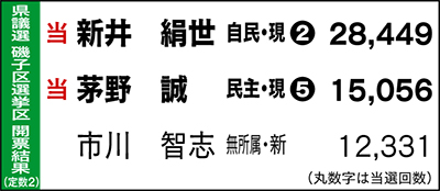 定数2に対して現職2人と新人で無所属の市川智志氏の三つ巴で争われた。前回トップ当選を果たした新井氏が前回から約3800票上積みし、2万8449票で2期目の当選を果たした。新井陣営は、投票が締め切られた午後8時以降、事務所で戦況を見守った。午後11時過ぎ当選確実の一報が事務所に伝わると集まっていた支援者ら約40人が喜びあった。11時25分に新井氏が事務所に姿を見せると、この日一番の盛り上がりに。新井氏は一人ひとりと握手をし、喜びを分かち合った。新井氏は「頂いた票は地域の皆さんがよりよい磯子を目指して期待している票だと思う。この4年間、ますます住みやすい磯子、夢と希望のある神奈川を目指していきたい」と2期目の決意を語った。