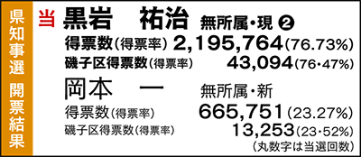 現職の黒岩祐治氏と無所属の岡本一氏の対決となった知事選は、黒岩氏が220万票近い圧倒的な支持を集めて再選した。今後も特区などを活用した経済活性化策を進めていくことを強調し「血の通った行政を実現させられるかが課題」と県民の声を今まで以上に県政に反映させることを2期目の目標に掲げた。