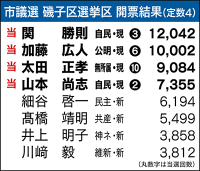 投開票当日、各投票所から集められた票の開票作業が始まると、現職4人の票が新人候補を上回った。関氏は前回から約5千票落としたものの、1万2042票を集めて前々回から続くトップ当選を果たした。2位には1万0002票の加藤氏、3位は9084票の太田氏、4位は7355票で山本氏だった。細谷氏、高橋氏、井上氏、川崎氏は及ばなかった。