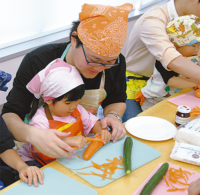 子どもがキュウリなどの野菜をピーラでスライスする作業には、パパが「手を切らないでね」と声をかけながら、後ろからサポート。和気あいあいと調理が進んでいた。