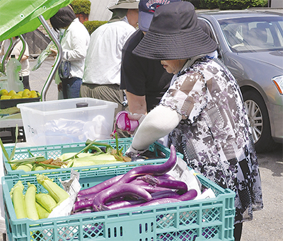 農園では、普段から併設された無人直売所に収穫した野菜を並べ販売している。今回の朝市は、農園と近隣住民との交流を目的に初めて開催され、訪れた人に満足してもらおうと、ナスやトマト、トウモロコシやスイカなど、多くの新鮮な夏野菜をブースに並べた。買い物客たちは「これはどうやって料理するの」とスタッフに尋ねながら朝市を楽しんでいた。