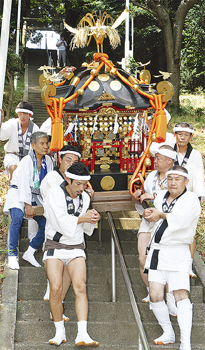 14日には神社で神事の後、御霊代(みたましろ)を大神輿に移して下山。担ぎ手の森睦などが大神輿を台に乗せ、200段近い石段を滑らせるようにゆっくり下ろし、待機していた子ども神輿や花山車と合わせ計8基が氏子地区を渡御。人々の安寧を祈念した。2日間とも横浜市無形民俗文化財保護団体の神田囃子森保存会のお囃子もあり、賑やかに幕を閉じた。