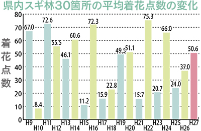 スギは2月から4月にかけて花粉を多く飛散させる。花粉を飛散するのは雄花のみで、この着花量を調査することで花粉飛散を予測する取り組みを県は18年前から毎年実施。今年度も昨年11月に県内30カ所の測定ポイントで、着花状況を調査したところ、「やや少なかった」昨年を上回り、さらに過去18年間の平均値もやや上回った。