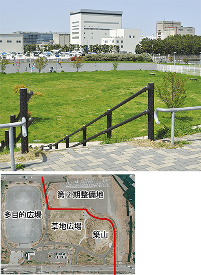 今回整備が行われるのは緑地の南部分で、草地広場や築山に面する約0・9haのエリア。フェンスで囲われ利用できずにいるが、毎年区の消防出初式では会場として利用されている。整備を担当する市港湾局では、年度内に工事を行い17年春の利用開始をめざしている。