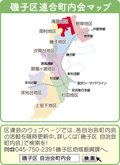 11の自治会町内会で構成されている滝頭地区の特徴は、福祉に力を入れている点。例えば、各自治会町内会では、健康体操や健康吹き矢、カラオケ大会など、スイッチON磯子の滝頭地区推進委員会のメンバーと協力して、様々な取組みを行っている。また、滝頭地区連合では、一人暮らしの高齢者の方を対象に年2回、地域ケアプラザで「サロン滝さん」を開催。地域ボランティアの出し物や園児の歌の披露など、楽しみながら顔の見える関係をつくり、幅広い世代が交流している。