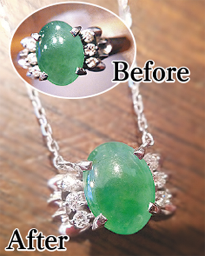 複数のジュエリーを組合せたリフォームや形見分けも可能。指輪からネックレスに変更(1万3千円〜)するだけで「今すぐ使えるジュエリー」に大変身。地金の下取りや手持ちの素材を生かした良心的な価格で、「『当時の思い出まで蘇った』そんなお客様の声が嬉しくて」とオーナー。