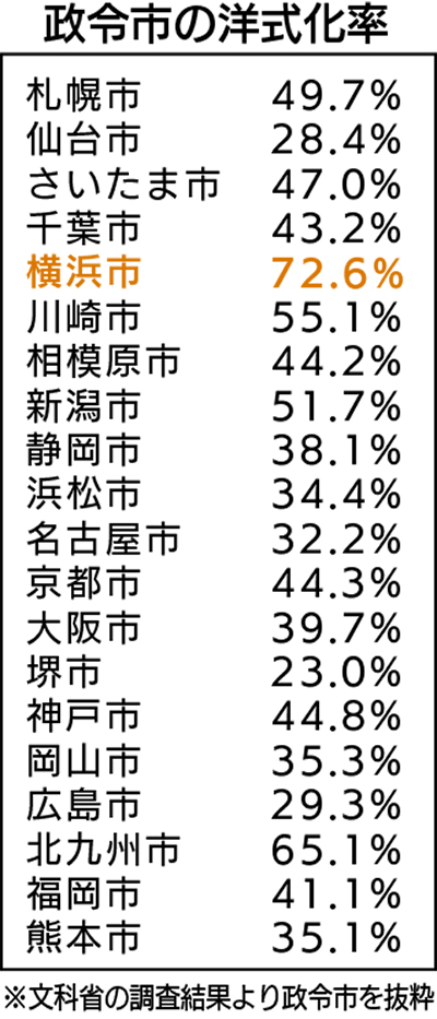 横浜市の小中学校の洋式化率は72・6%で全国平均を29・3ポイント上回った。全国に20ある政令市と比較すると、2位の北九州市よりも7・5ポイント上回り、政令市の中で最も低い23・0%の堺市とは3倍以上の差が開いた。