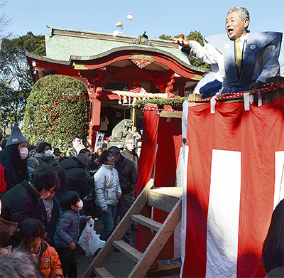 森浅間神社の節分祭では、神社周辺住民や園児、小学生らが訪れた。森浅間神社神田囃子保存会によるお囃子の披露が行われたあとに、かみしも姿の年男・年女などがやぐらに登場。「福は内、鬼は外」と声をかけながら福餅や福豆をまいた。境内に集まった来場者は手を伸ばし掴み取っていた。