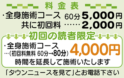 新規に限り、初回料無料で全身施術コースが60分から80分に延長する特典あり。この機会に違いの分かる施術を受けてみては。