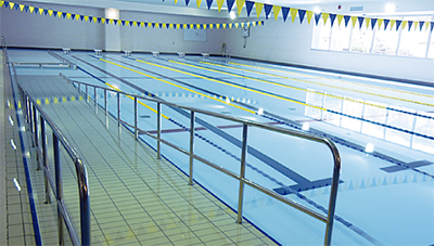 新館は鉄骨造2階建て。1階にある25m×6コースのプールには子どもから高齢者まで幅広い年代が楽しめるようにと水深50cmの幼児プールのほか、12mの緩やかなスロープを設置するなど館内はバリアフリー仕様となっている。