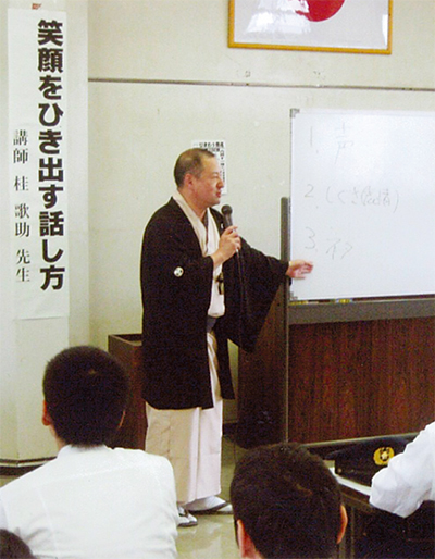 これはプロの噺家に話術を学ぶことで、署員の接遇向上に役立てようと企画されたもの。歌助さんは「笑顔をひき出す話し方」と題して講演し、相手の心をつかむ話し方について、自身の修行時代のエピソードも交えながら講義した。