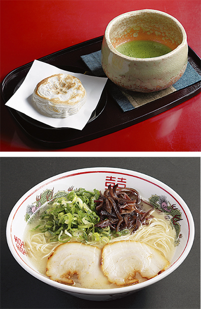 そのほか、「明月堂『博多通りもん』(5個481円)」や「チョコレートショップ『博多の石畳』(420円・各日限定100個)」など人気スイーツ、お酒、伝統工芸品など勢揃い。毎度行列ができるイートインコーナーでは「茶房かさの家『梅ヶ枝餅の抹茶セット』(630円)」や「元祖博多だるま『濃厚豚骨ラーメン』(1杯735円)」が味わえる。
