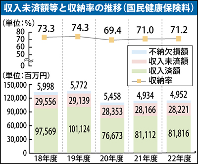 納付方法は給与から天引きとなる企業などの健康保険と違い、口座振替か納付書のみ。市は未納防止のため口座振替を勧めるが、22年度の口座振替世帯は、51・4%と前年度比0・2ポイント減少。勧奨も「加入時の窓口」「振替依頼書を年に3回送付」と改善までの打開策にいたっていない。