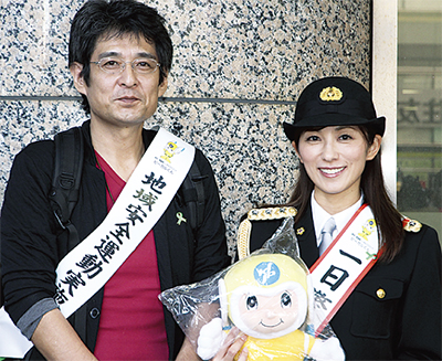 キャンペーンではフリーアナウンサーの中田有紀さんが1日警察署長を務めたほか、俳優の金田賢一さんも参加し、集まった多数の通行人らを前にひったくりや振り込め詐欺対策などの啓発活動を行った。