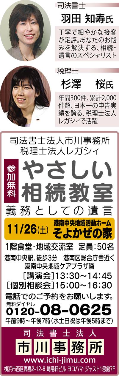 そんな時局を踏まえ、相続や遺言の疑問や不安を専門家が分かりやすく説明してくれる無料セミナー&相談会「やさしい相続教室」が11月26日(土)、港南中央地域活動ホーム「そよかぜの家」で開催される。
