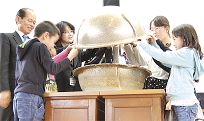 同小は昨年4月に100周年を迎え、7月には70周年記念事業として埋設されたタイムカプセルを30年ぶりに開封した。今回は空になったカプセルを再利用し、校庭の日時計の下に再び埋設。30年後に開封することにしているという。