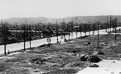 それからまもなく、「西の空一面を覆いつくす黒い塊」を目にする。それは、横浜に向けてマリアナ基地を未明に飛び立ったアメリカ第21爆撃機集団に所属するB29の編隊で、その数は517機にもおよんだ。驚く間もなく、次の瞬間には「ダダダダーバンバン」と大地を揺さぶる爆発音。「振り返ると、さっきまでいた黄金町駅はもちろん、街全体から黒に近い灰色の煙があがっていた。狂った龍が暴れまわっているようだった」。一瞬にして「地獄」と化した街を背に、高台に建つ校舎への急坂を無我夢中で駆け上ったが、後から追いかけるように迫る熱風は見る間に周辺の木々の葉を焼けつくしていった。