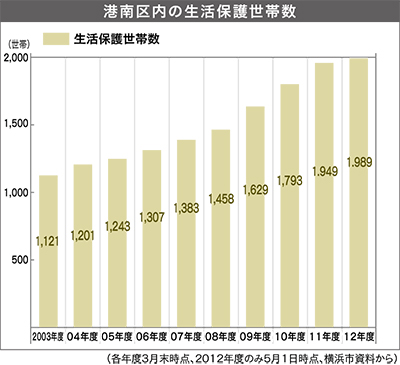 全国における生活保護受給世帯数は2012年3月時点で152万世帯と過去最多を更新するなか、港南区でも約2000世帯に上り、過去10年間でほぼ倍増していることが分かった。