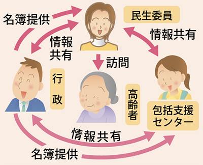 民生委員は、自治会町内会の推薦と厚生労働大臣の委嘱を受けた地域住民で、地域福祉増進のために活動している。今までも独居老人の見守り活動を行ってきたが、個人情報保護の観点から現状把握については自力で探さなくてはならないなど限界があった。