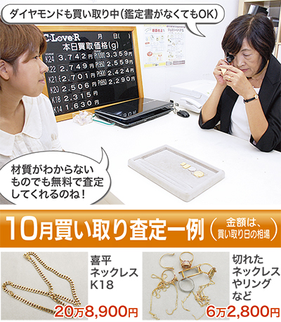 同店は今年で3周年を迎えた地域密着のお店。「金歯1本から買い取ります」と気軽な来店を呼びかける。古い指輪や切れたネックレス、コイン、インゴット、プラチナとゴールドのコンビリングなど、種類や品物を問わず何でも査定。
