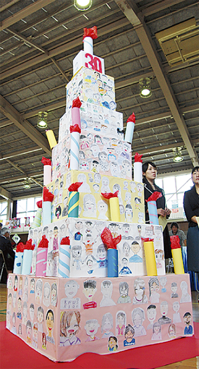 式典はPTA、地元の連合自治会町内会など、同小にゆかりのある地域住民が主に参加。会場には、児童が自ら描いた似顔絵を張り付けた紙製の誕生ケーキを設置し、30周年をお祝い。また、アトラクションとして同小の金管バンド「BLUE ROBINS」が出演。ジブリ映画のテーマ曲等を演奏すると拍手が沸き起こった。また式典終了後は祝賀会も行われ、関係者は懇親を深めていた。