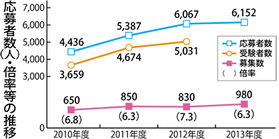 「応募数が多ければ優秀な人材を確保できる」と同担当者。13年度の倍率は6・3倍と、前年度の7・3倍を下回ったが、「全国的に教員採用数が増加する中、最低限の倍率を確保できた。(募集数が特に増加した)小学校区分でも5倍近い倍率となり、一安心」との見方を示した。
