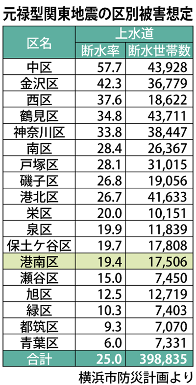 しかしながら、被災時の断水を現状で防ぐ策はない。区によって断水率に差はあり、液状化の危険が高い沿岸部では、中区で断水率が57・7%であるなどおおむね上がるのに対し、地盤が固く、比較的震度が低いと想定される北部や西部は下がる傾向だ。港南区は19・4%が断水になると想定されている。水道局では断水防止に向け、更新作業を粛々と続ける一方、現時点では災害用地下給水タンク134基、緊急給水栓358カ所で給水するといった事後対応となる。