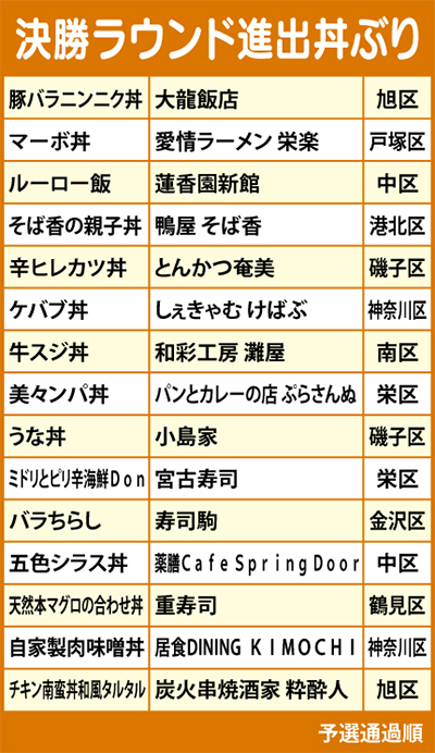 有効投票数は1万89通。予選の1位通過は、大龍飯店(旭区)の「豚バラニンニク丼」で、千票近くを得て2位を400票近く離す結果となった。一方、港南区の鉄板バルHANANOKIの「焼きマグロ丼」は決勝に進めなかった。