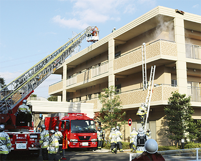 訓練には港南消防署、港南消防団第一分団、隣接する特別養護老人ホーム「芙蓉苑」関係者のほか、中永谷町内会も避難誘導などの役割で参加。3階居室からの出火を想定し、はしご車も出動して救出訓練を行ったほか、施設に向かっての放水も実施した。