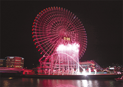 世界最大の時計機能付き大観覧車「コスモクロック21」の秒針を使い、来園者とカウントダウンを実施。時計が午前0時を指した瞬間には、東京都の花火ショー制作会社、(株)丸玉屋の下福史さん=今号人物風土記=の指揮により、約1500発の仕掛け花火が音楽とともに打ち上げられる。