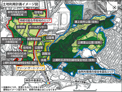 自然保全エリアは、基本的に開発を行わず、「上郷町石原特別緑地保全地区」として樹林地を保全するほか、農地を中心とした区域を都市施設の公園「瀬上自然公園」約3・8ha、「上郷里山公園」約4・1haとする(名称はいずれも仮称)。