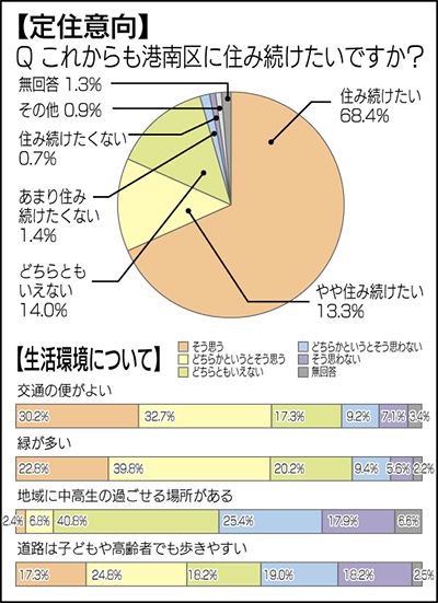 港南区に住み続けたいかという「定住意向」についての調査では、「住み続けたい」「やや住み続けたい」という人が8割以上を占め(81・7%)、前回と比べて4・9ポイントの増加だった。横浜市が同時期に実施した市民意識調査では、今の住まいに住み続ける気持ちかという項目で「住み続ける」「たぶん住み続ける」という人が61・3%だったことと比べ、高い定住意向が結果に表れた。