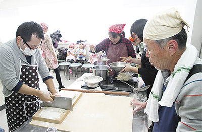 今回は1年間の活動の締めくくりとして収穫したそばを打ち、試食会を開催。そば打ちを恒例の地域行事としているさつき台自治会(林金吾会長)の指導協力の下、区民35人がウィリング横浜の調理室に集まり、そば打ちに挑戦した。