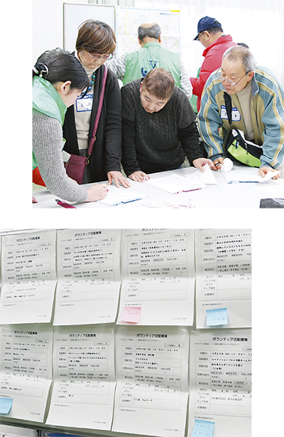 センターに見立てた会場には受付から始まり、ボランティアを依頼する被災地域からの情報=写真下=や区内の地図の掲示、トランシーバーなど活動に必要な物資の提供や活動報告の窓口が設けられた。ボランティア役の参加者は質問もしながら、メンバーの話を興味深く聞いていた。