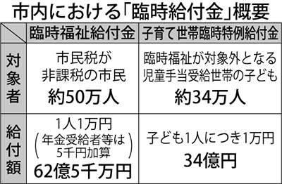 市によると、市内の「臨時福祉」の対象者は約50万人で、給付額は62億5千万円。2月の補正予算には、事務経費などを含め、計約73億円を盛り込んだ。