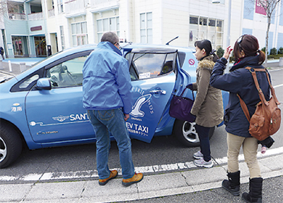 今回は港南区港南台の日本サントスキャブの協力でEV3台を用意。ベイサイドマリーナから新杉田駅まで無料運行を行い、3日間で40組が利用した。