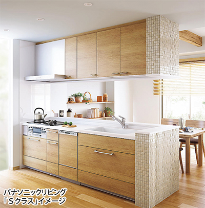 注目は大和ハウスオリジナルのシステムキッチン。パナソニックリビングの「Sクラス」やリクシルの「リシェル」、クリナップの「クリンレディ」「ラクエラ」など各モデルを揃え、I型やL型、アイランド型など種類も豊富。どのモデルも大容量の収納があり、使いやすい。価格も「Sクラス」の標準仕様・I型・W2550サイズだと、工事費別途で49万8500円(税込)〜となる。