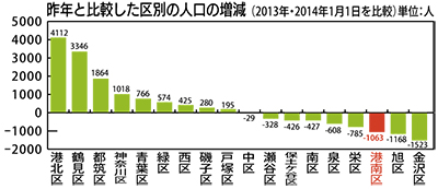人口の増加率が最も高かったのは、港北区の1・23%(4112人増)で、次いで鶴見区の1・21%(3346人増)、都筑区の0・9%(1864人増)だった。一方、減少率が最も高かったのは金沢区の0・74%(1523人減)で、次いで栄区の0・63%(785人減)だった。港南区は3番目に高い0・49%(1063人減)で、21万7782人となっており、人口減少傾向は続いている。