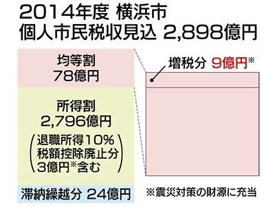 2014年度から10年間、個人の住民税が年間1000円増税される。地方税法の臨時特例法の施行に伴うもので6月徴収分から対象。内訳は市民税と県民税が500円ずつとなり、横浜市では約9億円の増収を見込む。使途は、区庁舎や保育所、市立学校の耐震化事業などに使われた市債の償還財源に充てられる。