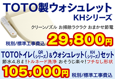 リフォームは各メーカーの商品が特価。今ならサマーセールとして8月末日までTOTO製のウォシュレットKHシリーズが2万9800円(工事費込/税別)に。同商品はほとんどのトイレに設置可能で、暖房便座や温水洗浄、省エネなど機能も充実。簡単に取り外して元に戻せるため、賃貸住宅の人にもおすすめだ。特価商品につき、左記電話のみ受付(店頭受付不可)。