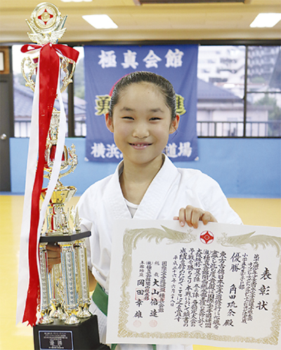 小学生から高校生までが出場する空手の全国大会「グランドチャンピオン決定戦」(主催・極真会館関西総本部)が6月28日、大阪府立体育会館で行われ、極真空手横浜港南台道場に通う角田琉奈(るな)さん(栄区在住=写真)が小学5年生女子の部で優勝した。角田さんは昨年、同大会小学4年生の部でも優勝しており、2年連続の優勝を果たした。