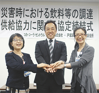 コカ・コーラセントラルジャパン(株)と港南区・戸塚区は9月1日、戸塚区役所で「災害時における飲料等の調達供給協力に関する協定」を締結した。