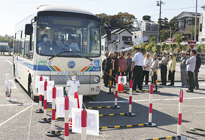 港南在住の岩本和子さん(78)は、「運転席に座ったのは初めて」と言い、「バスの近くは死角で全然見えなかった。自分自身も、歩行者として気を付けようと強く実感した」と感想を話した。