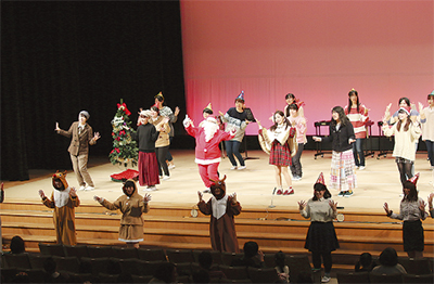 また今年の劇はグリム童話『小人のくつや』のクリスマスバージョン。サンタクロースやトナカイに扮した学生が登場すると、子どもたちは一斉に大騒ぎに。その後サンタらは、クリスマスソングの演奏や歌で会場を盛り上げた=写真。