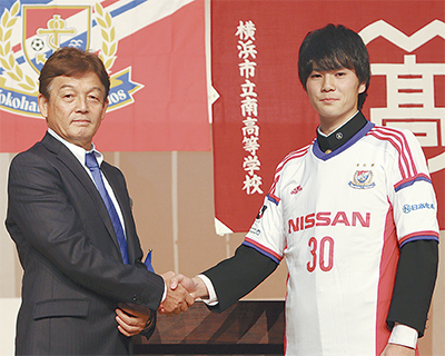 「ずっと目標にしていた、『マリノスの選手』としての生活が始まる。だけど本当の目標はもっと上にある」。センター試験直前にも関わらず、同級生ら約100人以上が駆けつけた会見の場で、トップチームの背番号「30」を手にした田口君は思いを語った。