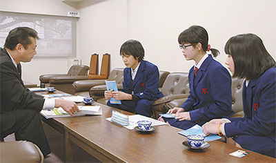 また同日、丸山台中学校から訪れた3人は、瀬之間康浩市議との打ち合わせに同行。市会本会議場の見学も行い、堤菜々香(ななか)さんは「人と人とのつながりが大切な仕事」、天野太陽君は「聞いたことを記事に書くのが大変そう」、伊東萌奈美(もなみ)さんは「色々な役割の人が協力して紙面ができてると知った」と話していた。