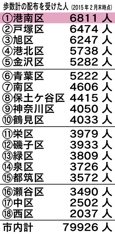 40歳以上の横浜市民を対象に横浜市が取り組む「よこはまウォーキングポイント」事業の申し込み人数が当初予定の5万人を超え、歩数計の配布を受けた人は、2月末時点で市内約8万人にのぼり、港南区民では市内18区中最多の6811人(男性2766人、女性4045人)となった。