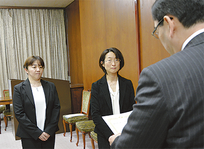 交付式で南部病院からは小児科部長の田中文子医師と、看護師長の関根美保さんが出席し、柏崎誠副市長から指定書を手渡された=写真。指定書交付を受けて田中医師は「今後4病院で連携を取りながら、保育や教育も含めたより質の高い小児がん診療を行っていきたい」と話していた。